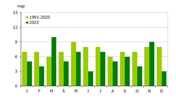 2025-ben 68 napon haladta meg a csapadék mennyisége az 1 mm-t, ami 19 nappal kevesebb az 1991-2020-as átlagnál. A szokásos éves menet (13. ábra) szerint májusban kellene a legtöbb 1 mm csapadék feletti napot detektálnunk, melyet a június és a július követ. 2025-ben a május kicsit, a június viszont nagyon elmaradt az átlagtól, 8 helyett 3 ilyen nap adódott, a júliusi érték pedig 1 nappal volt kevesebb a megszokottnál. Két hónapban volt több 1 mm-t meghaladó csapadékú nap a megszokottnál, márciusban 4-gyel, novemberben 1-gyel több adódott. Nem csak a nyári időszakban kaptunk az 1991-2020-as normálnál alacsonyabb értékeket: februárban és októberben 7 helyett 4, míg decemberben 8 helyett 3 ilyen nap jelentkezett.
