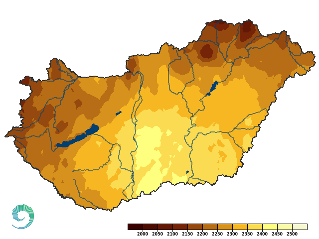 2025-ben a napsütéses órák éves összege hazánk területén 2050 és 2450 óra között változott. Az ország déli részén sütött a legtöbbet a Nap, általában 2350-2450 órát, míg a legkevesebb napsütéses óra az északnyugati (Győr-Moson-Sopron, Zala és Somogy) és északkeleti (Borsod-Abaúj-Zemplén, Szabolcs-Szatmár-Bereg és Heves) vármegyékben volt, itt többnyire 2100-2250 óra volt a jellemző (21. ábra).