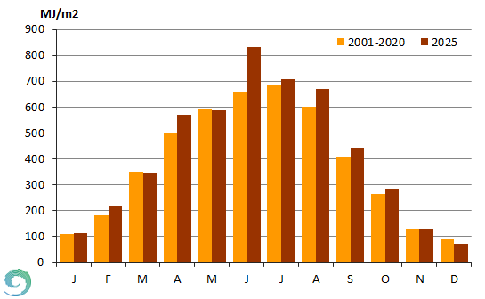 A Napból közvetlenül érkező (direkt) sugárzás és az égboltról érkező szórt (diffúz) sugárzás összegét globálsugárzásnak nevezzük. Területi eloszlása a domborzati adottságok mellett az átlagos felhőborítottsággal van kapcsolatban. A legmagasabb értékeket a derült nyári hónapokban, sokévi átlag szerint júliusban várjuk. A globálsugárzás évi összege Budapest Pestszentlőrinc állomáson 2025-ben elmaradt a 2001-2020-as sokéves átlagtól. A legmagasabb havi összeget (832 MJ/m2) ebben az évben júniusban jegyeztük, ami jelentősen (26%-kal) meghaladta az ilyenkor szokásos mennyiséget (22. ábra). 4 hónapban is a megszokottnál kevesebb volt a globálsugárzás összege, márciusban, májusban és novemberben mindössze 1% körül mozgott az eltérés, de decemberben 20% hiányzott. A normáltól vett legnagyobb százalékos eltérés júniusban adódott (+26%), amit a december (-20%), majd a február (+18%) követ. A legkisebb százalékos eltérést pedig novemberben figyeltük meg (-0,6%).