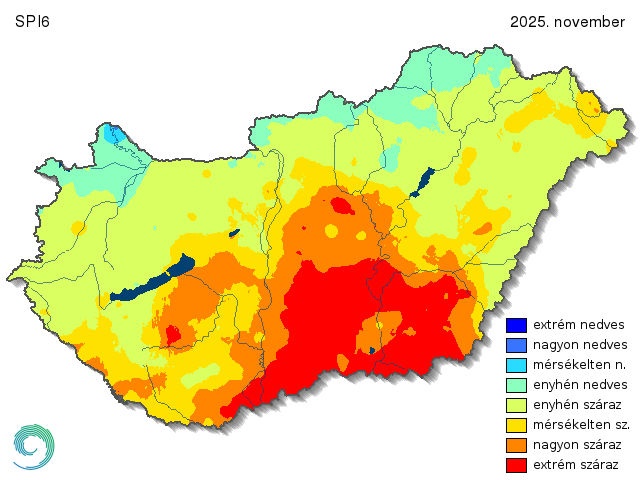 Az előzőnél hosszabb időszakra tekint vissza az SPI6, amely a novembert megelőző fél év aszályosságát mutatja be (15. ábra). Itt már csak északon elvétve fordul elő nedves kategória, az ország nagyobb része száraz. Mivel 2025 nyara nagyon száraz volt, az ősz pedig közel átlagos mennyiségű csapadékot hozott, így a két évszakot együtt vizsgálva inkább a szárazság dominál. A Balatontól délre, a Duna-Tisza közén, valamint a Körösöktől délre nagyon száraznak számít a vizsgált fél év. Ezen belül, az Alföld déli területei már extrém szárazak voltak.