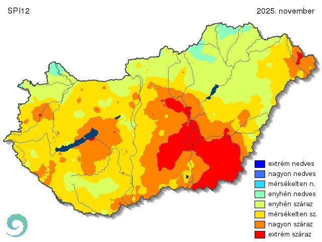 Az 1 éves időtávlatban érkező csapadékmennyiség hatása (SPI12) a 16. ábrán látható. Itt a féléves térképhez hasonlóan alig van nedves térség, hazánk száraznak számít. Egy évvel ezelőtt ugyanezen térképen még az ország fele enyhén nedves volt, és a nagyon száraz kategória csak kis foltokban jelent meg. A 2024 decembere és 2025 novembere közti időszak viszont nagyon aszályos volt. A 16. ábrán a Dunántúlon és az Alföldön is kiterjedt térségek nagyon szárazak, sőt a Körös-Maros köze, valamint a Duna-Tisza közének egy része extrém száraznak adódott.