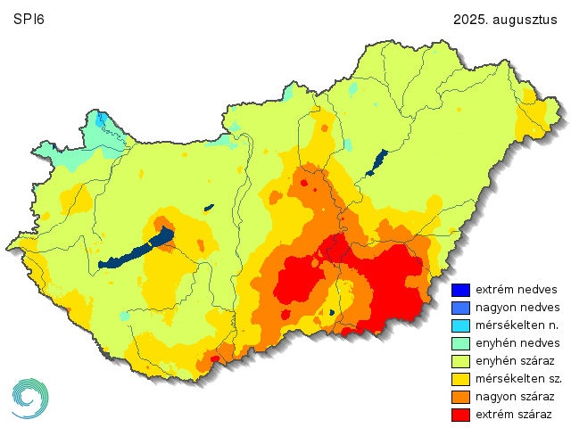 A fél éves időtávlatban lehullott csapadékmennyiség (SPI6) hatása a 16. ábrán látható. Az időszak a tavaszi és nyári hónapokat öleli fel, így jól tükrözi a vegetációs periódus csapadékviszonyait. A térképet túlnyomórészt az enyhén száraz kategória uralja, ugyanakkor az Alföld déli és középső részén, valamint a Balaton keleti medencéjénél extrém, illetve nagyon száraz területek is megjelentek.