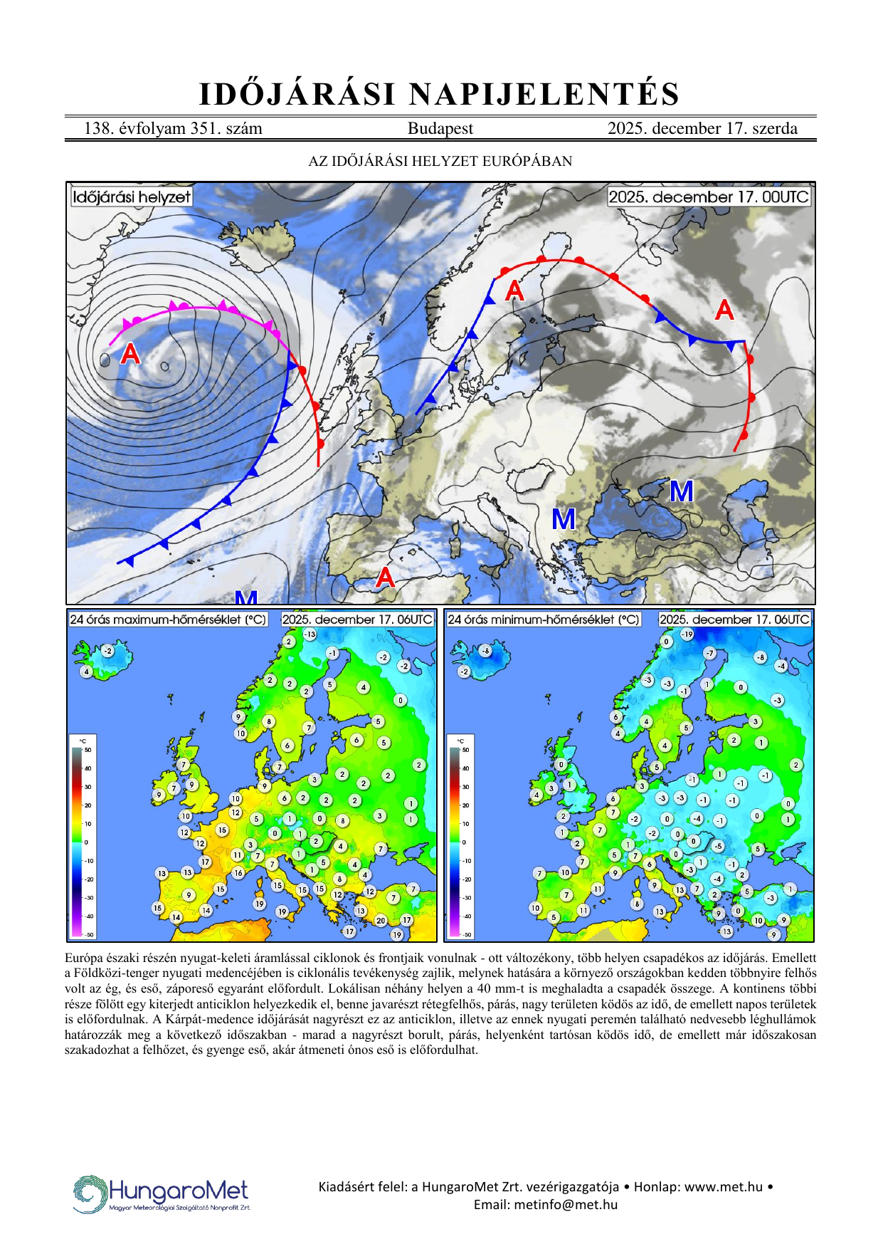 Az európai kitekintés a fronttérkép és a rövid szöveges elemzés mellett bővül a hőmérséklet napi minimum- és maximumértékeit ábrázoló térképekkel.